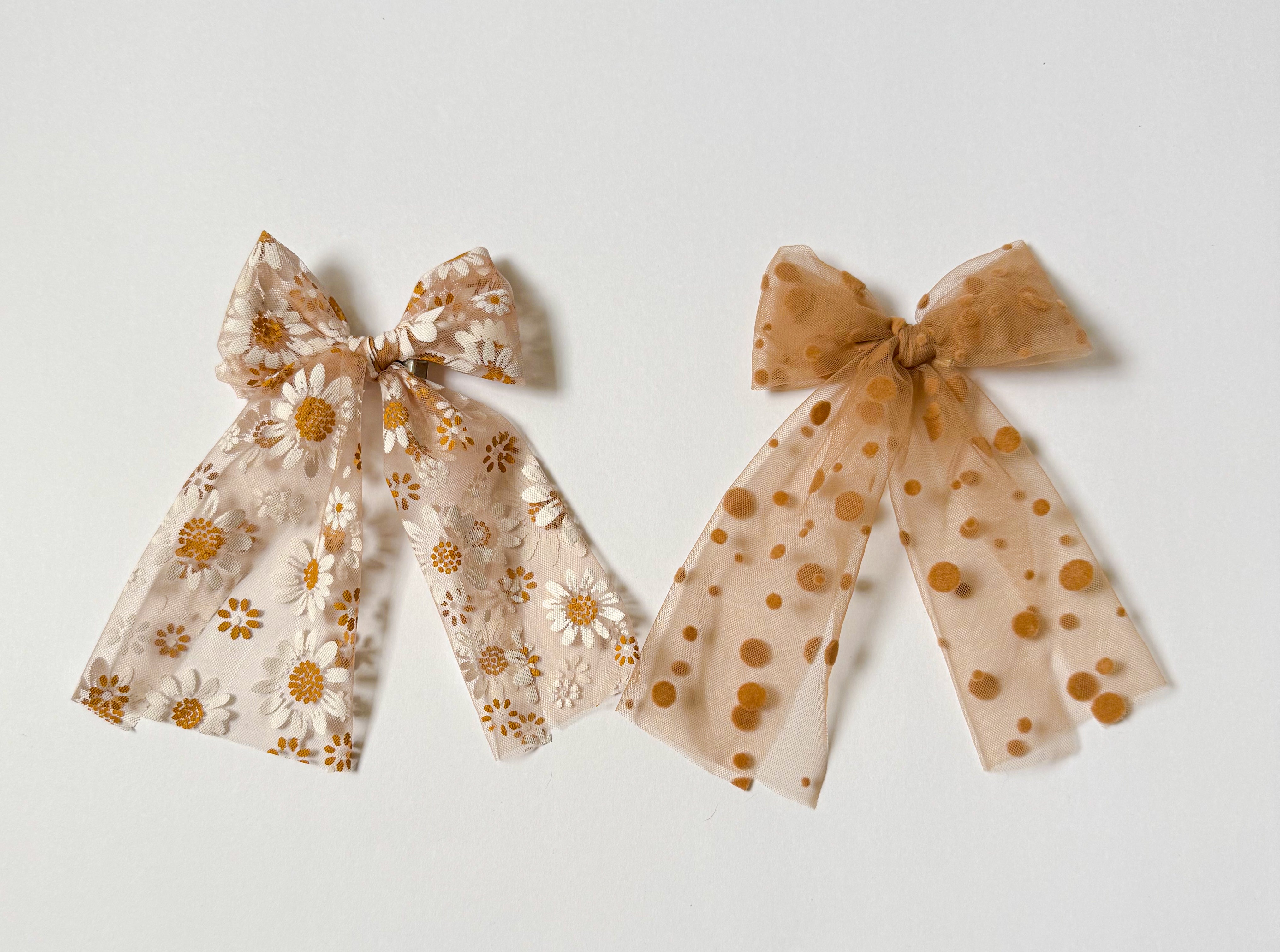 Latte: A warm honey-brown silky tulle with soft velvet dots, hand tied in our classic Genevieve style bow. Perfect for our fall lovers!