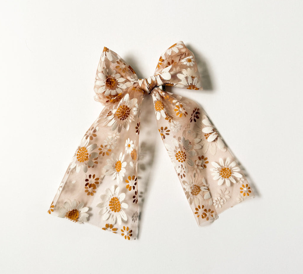 Blossom: Dreamy tulle sprinkled with white daisies and warm golden centers, hand tied in our classic Genevieve bow style. It’s like sunshine bottled up in a bow!